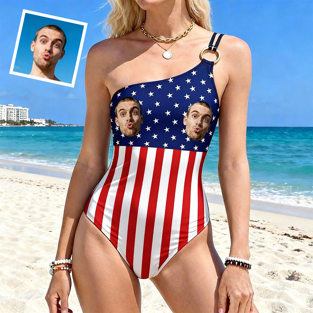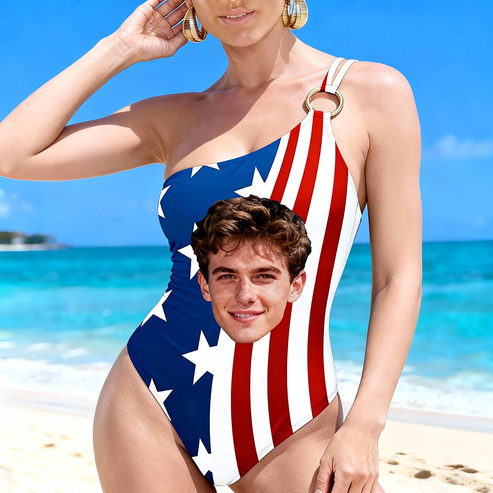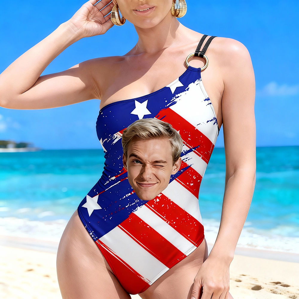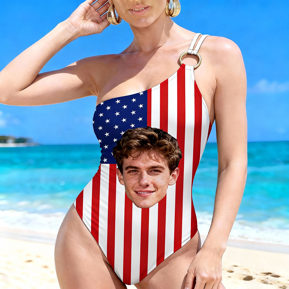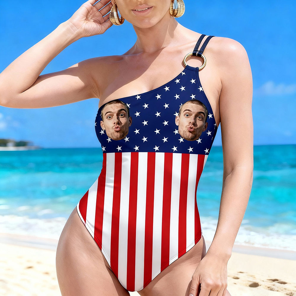 Personalized Face Swimsuit Custom Women's One-shoulder Swimwear American Flag Bathing Swimsuit