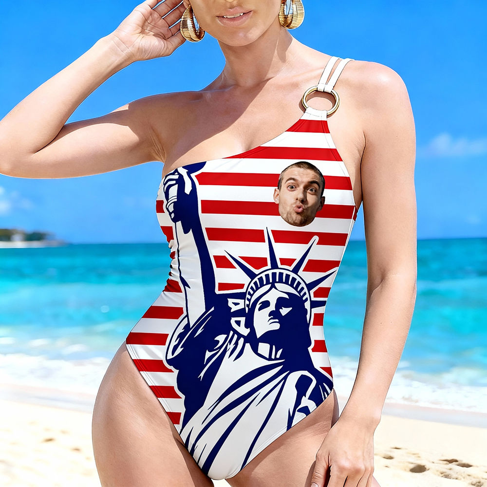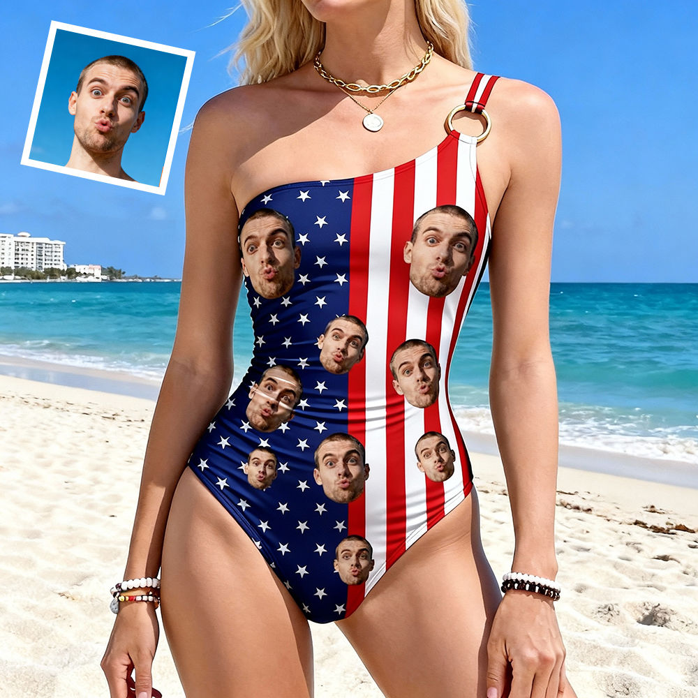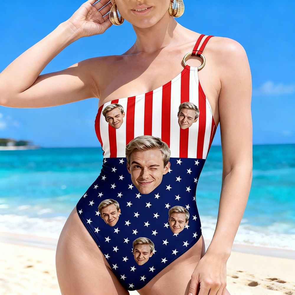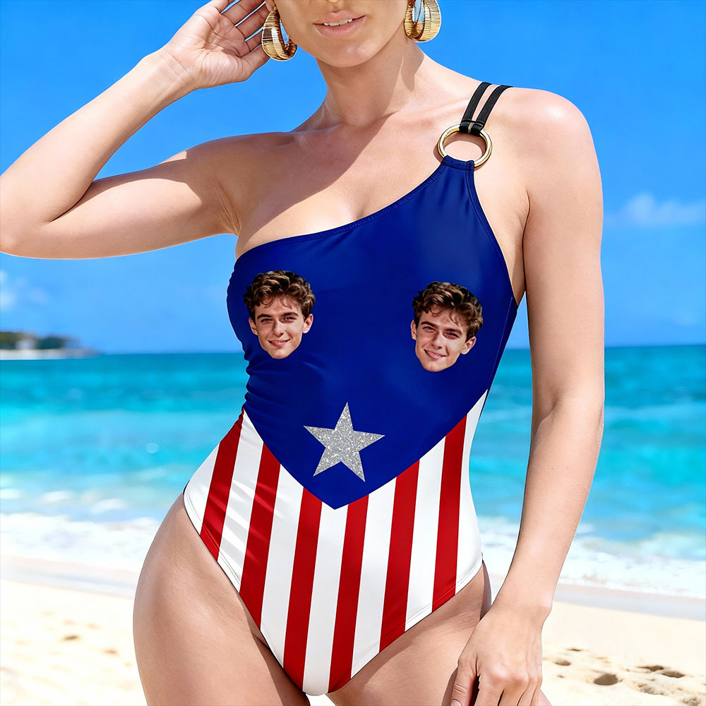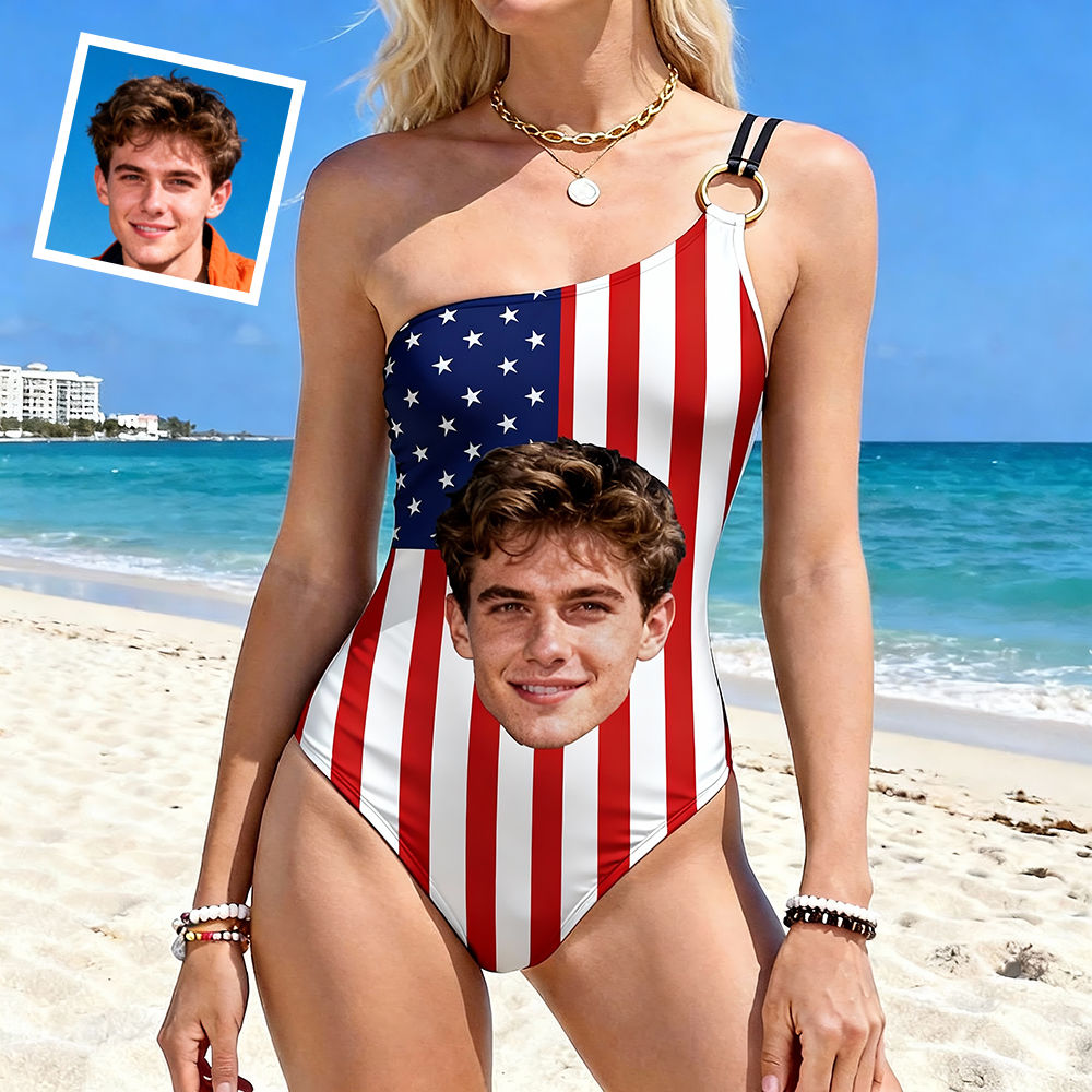 Personalized Face Swimsuit Custom Women's One-shoulder Swimwear American Flag Bathing Swimsuit