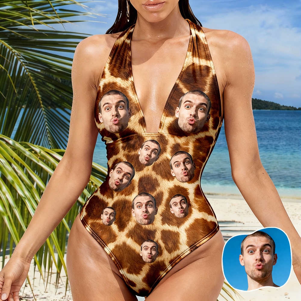 Personalized Face Swimsuit Custom Women's Deep V-neck Halter Swimwear Animal Pattern Bathing Swimsuit