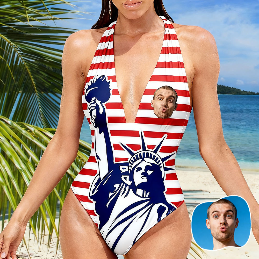 Personalized Face Swimsuit Custom Women's Deep V-neck Halter Swimwear American Flag Bathing Swimsuit
