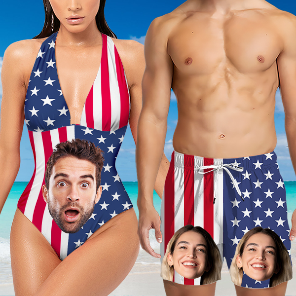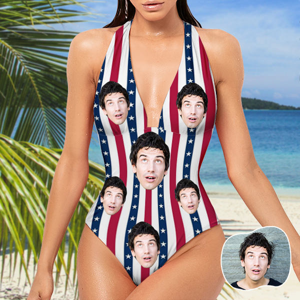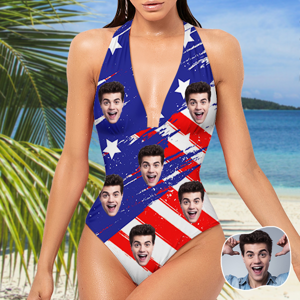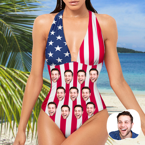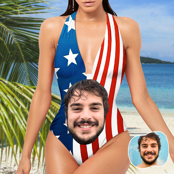 Personalized Face Swimsuit Custom Women's Deep V-neck Halter Swimwear American Flag Bathing Swimsuits For Wife