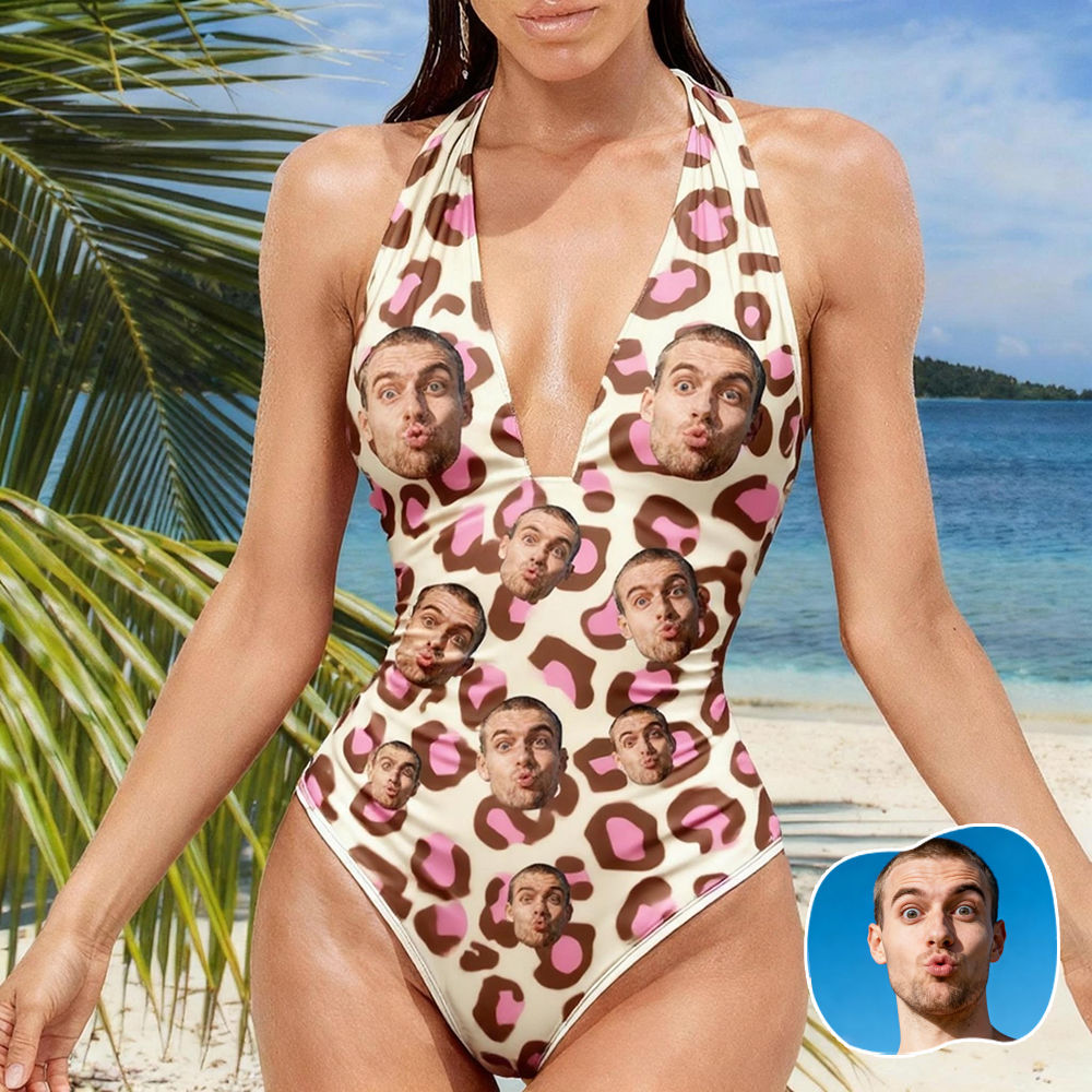 Personalized Face Swimsuit Custom Women's Deep V-neck Halter Swimwear Animal Pattern Bathing Swimsuit