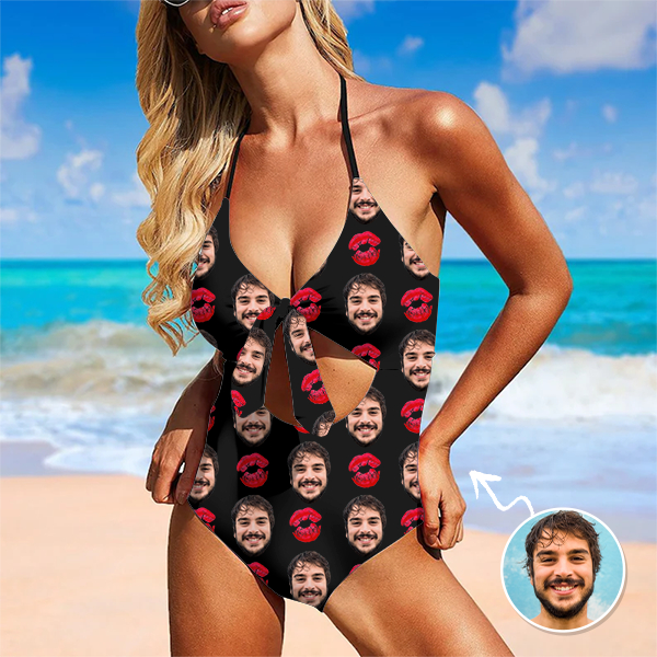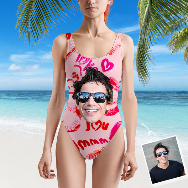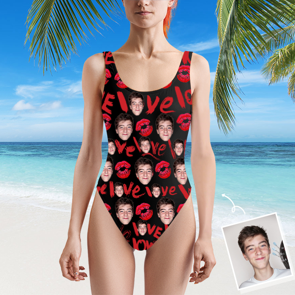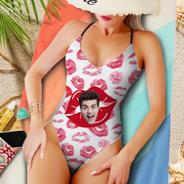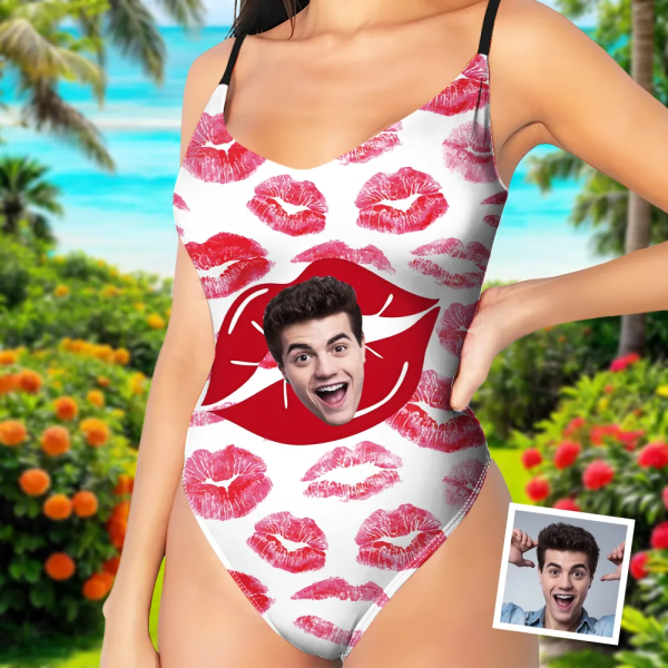 Custom Beach One-piece Bathing Swimsuit Personalized Face Red Lips Love Photo Swimsuit For Women,gift For Wife