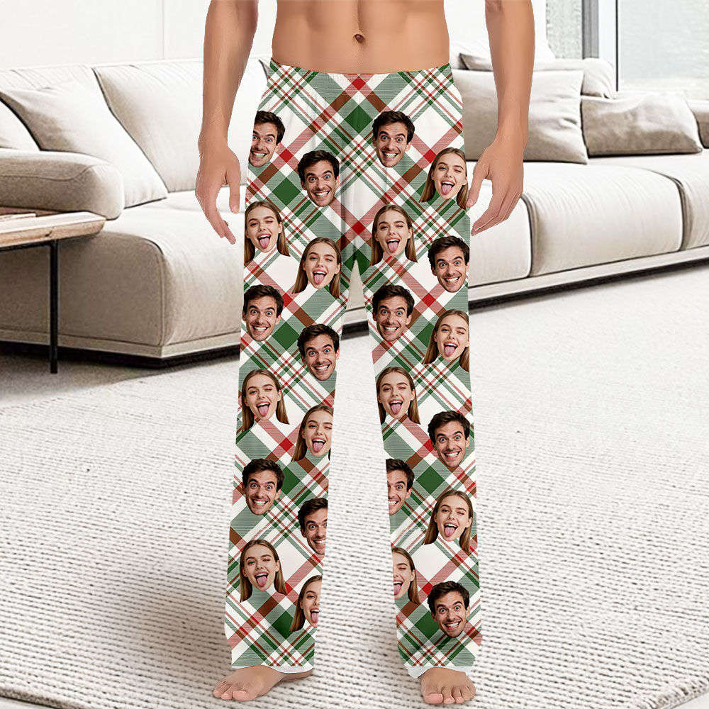 Custom Face Long Pajama Pants Custom Christmas Green Plaid Photo Pajamas Gift For Men