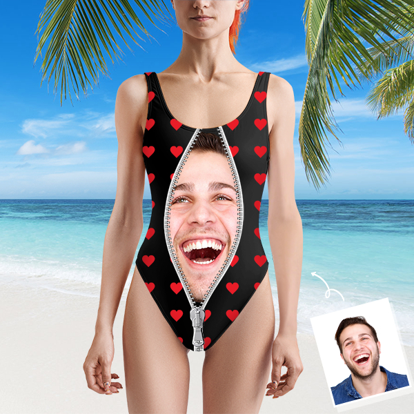 Custom Beach Zipper Red Heart One-piece Bathing Swimsuit Personalized Photo Swimsuit With Face Funny For Women,gift For Wife