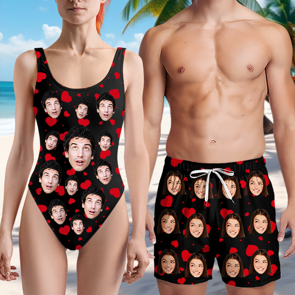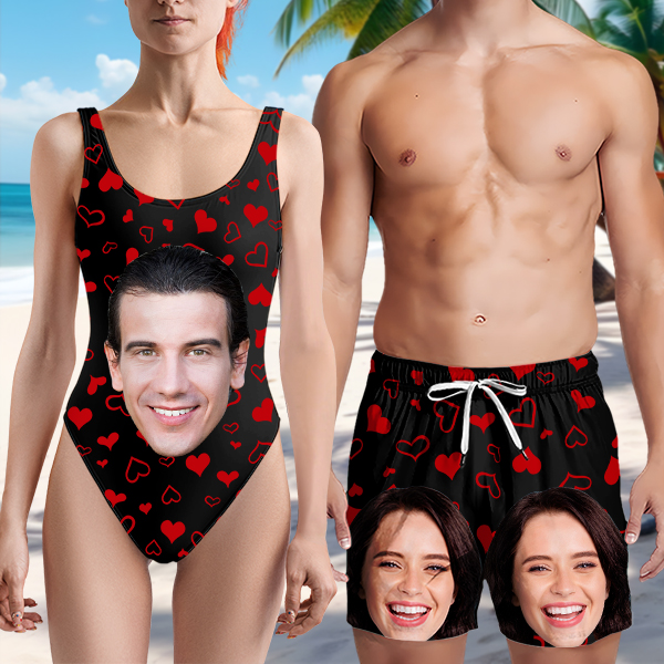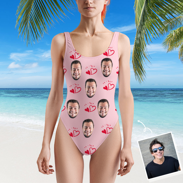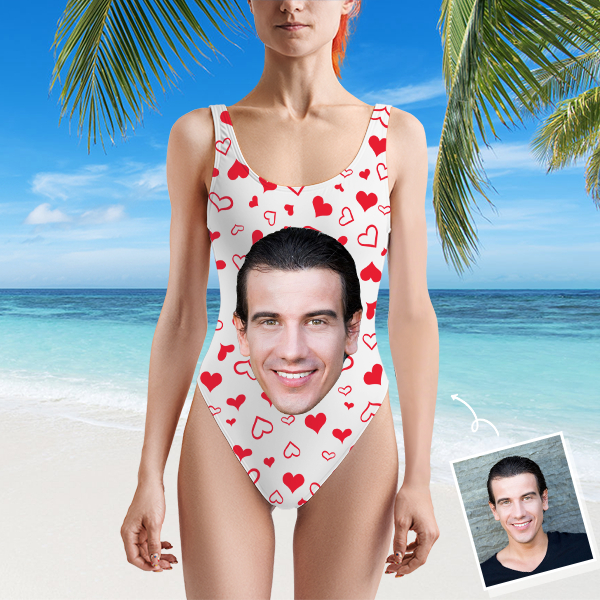 Custom Beach Red Heart One-piece Bathing Swimsuit Personalized Face Photo Swimsuit For Her,gift For Wife