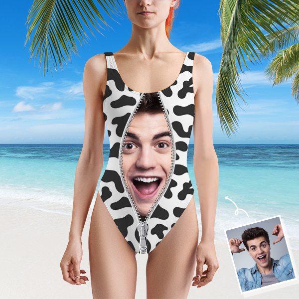 Custom Beach Zipper Cow Pattern One-piece Bathing Swimsuit Personalized Photo Swimsuit With Face Funny For Women,gift For Wife
