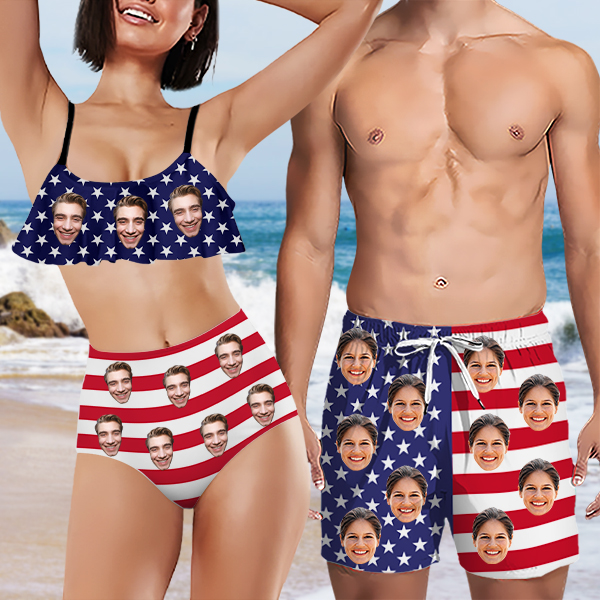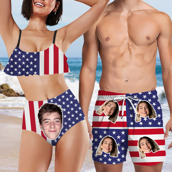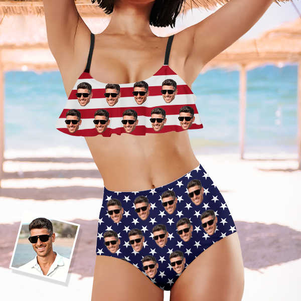 Custom American Flag Bathing Two Pieces Bikini Suits Women's Ruffle Summer Suits High Waisted Bathing Suits Gift For Wife