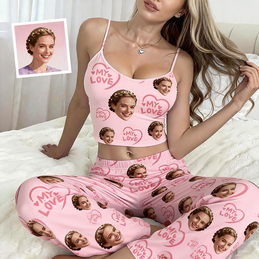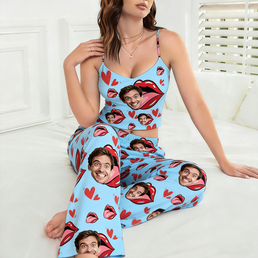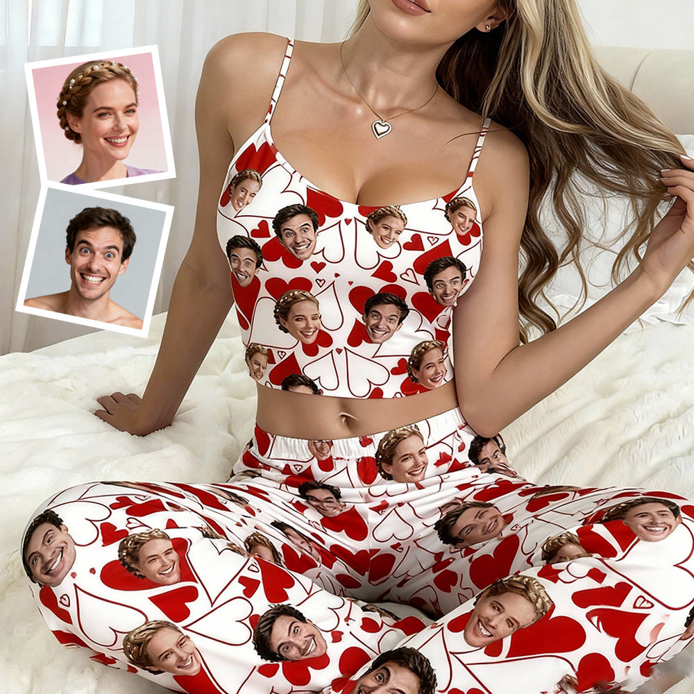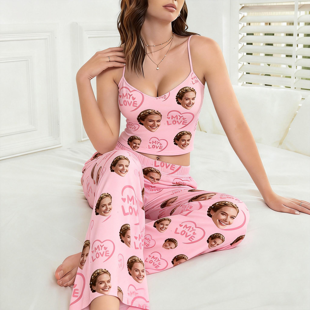Custom Cami Top Pajamas Set Face & Name Long Pants Pajamas Custom Photo Pajamas Gifts For Valentine Day For Wife For Girlfriend