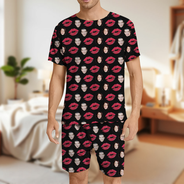 Custom Face Short Sleeve Pajamas Custom Red Lips Photo Pajamas Gift For Couple