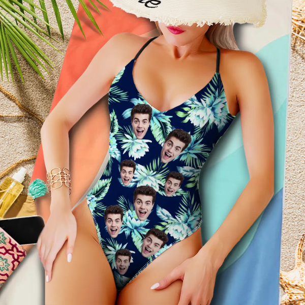 Custom Hawaiian Hibiscus V-neck One-piece Bathing Swimsuit Personalized Photo Deep V-back Straps Swimsuit For Women,gift For Wife