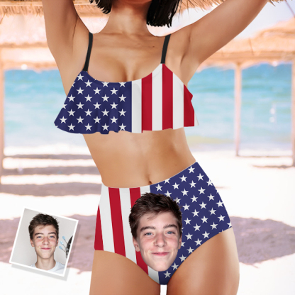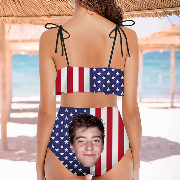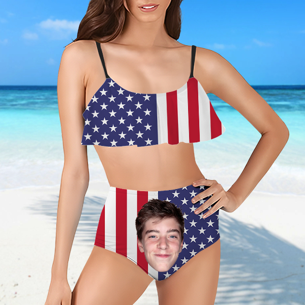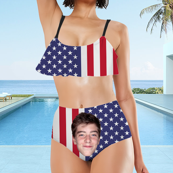 Custom American Flag Bathing Two Pieces Bikini Suits Women's Ruffle Summer Suits High Waisted Bathing Suits Gift For Wife