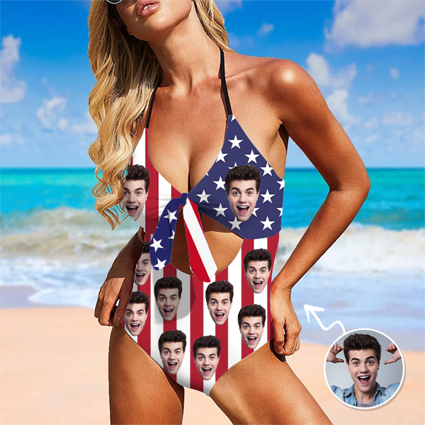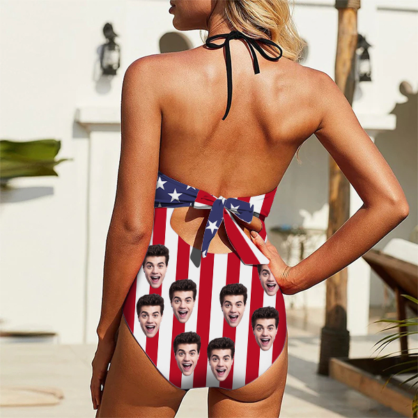 Custom American Flag Beachwear Swimsuit Halter Neck One Piece Bathing Suit,gift For Her