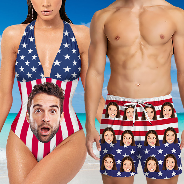 Custom American Flag Halter One-piece Bathing Swimsuit Personalized Independence Day Deep V-neck Swimsuit For Women,gift For Wife