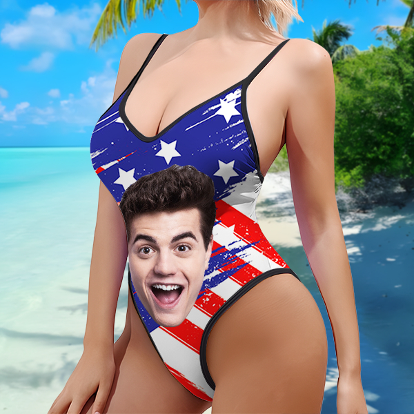 Custom American Flag One-piece Bathing Swimsuit Personalized Face Deep V-neck Straps Swimsuit For Women,gift For Wife