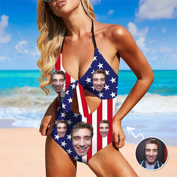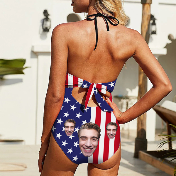 Custom American Flag Swimsuit Halter Neck One Piece Bathing Suit,gift For Her