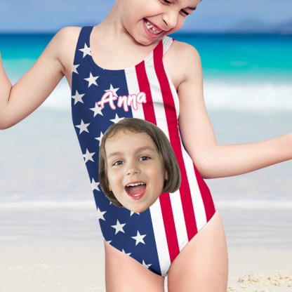 Custom American Flag Swimwear Face Independence Day Personalized One Piece Swimsuit Gift For Kids For Girls