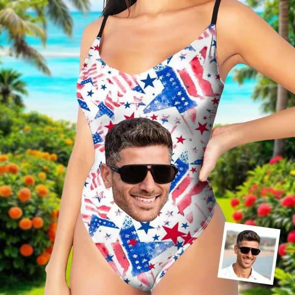 Custom American Flag V-neck One-piece Bathing Swimsuit Personalized Face Straps Swimsuit For Women,gift For Wife