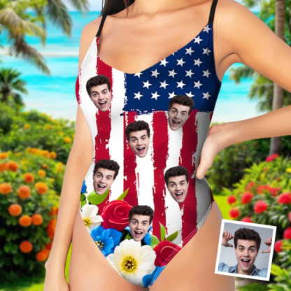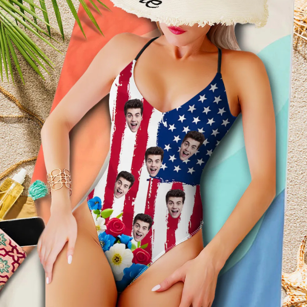 Custom American Flag V-neck One-piece Bathing Swimsuit Personalized Swimsuit For Women,gift For Wife