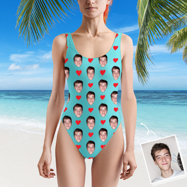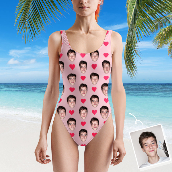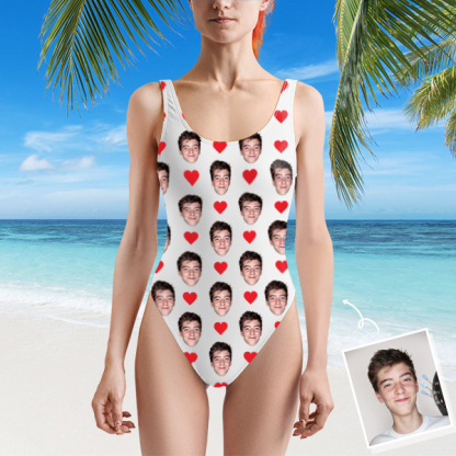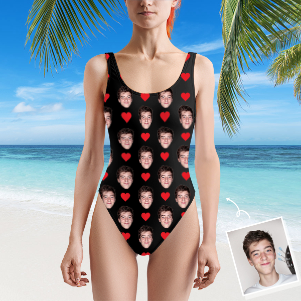 Custom Beach One-piece Bathing Swimsuit Personalized Face Red Heart Photo Swimsuit For Women,gift For Wife