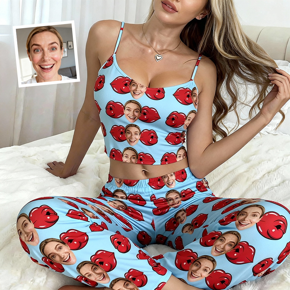 Custom Cami Top Pajamas Set Face & Name Long Pants Pajamas Custom Photo Pajamas Gift For Valentine Day For Wife For Girlfriend