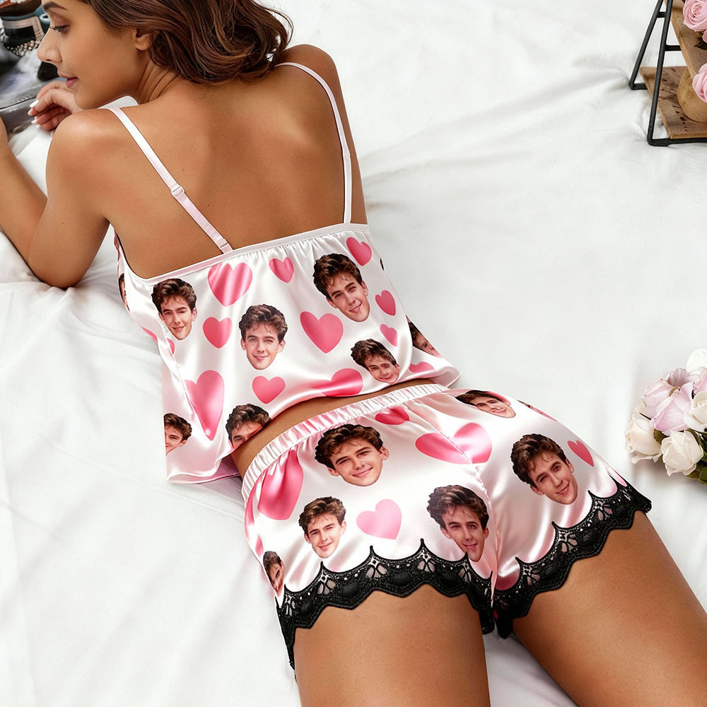 Custom Cami Top Shorts Lace Pajama Set Sleepwear, Face And Name Shorts Pajamas, Custom Photo Pajamas, Valentine's Day Gift, Suitable For Wife And Girlfriend