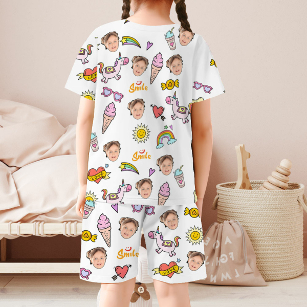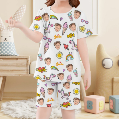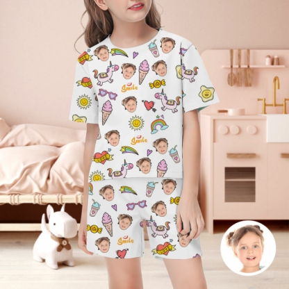 Custom Cartoon Stickers Photo Pajamas Crew Neck Short Sleeve Short Pants Face & Name House-wear Suit For Girls