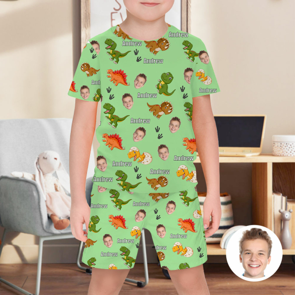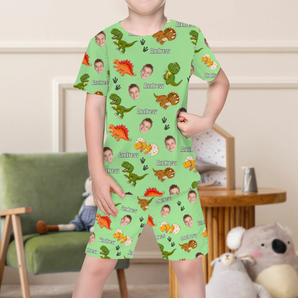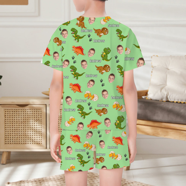 Custom Dinosaur-boy Photo Pajamas Crew Neck Short Sleeve Short Pants Face Light-green House-wear Suit For Boys For Kids