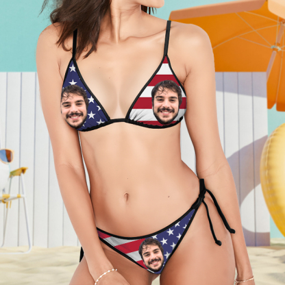 Custom Face American Flag String Halter Tie Side Low Waisted Triangle Bikini Personalized Bathing Suit Women's Two Piece Swimsuit Summer Beach Pool Outfits