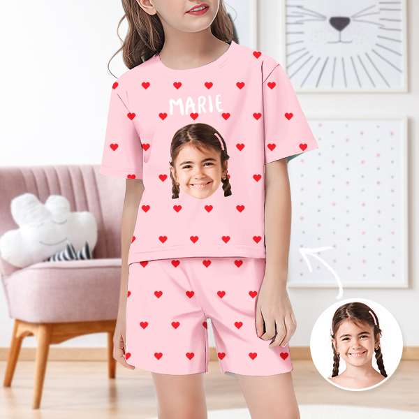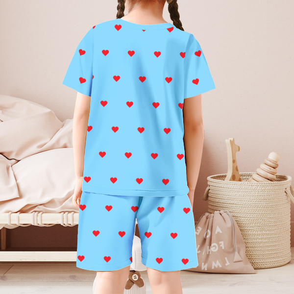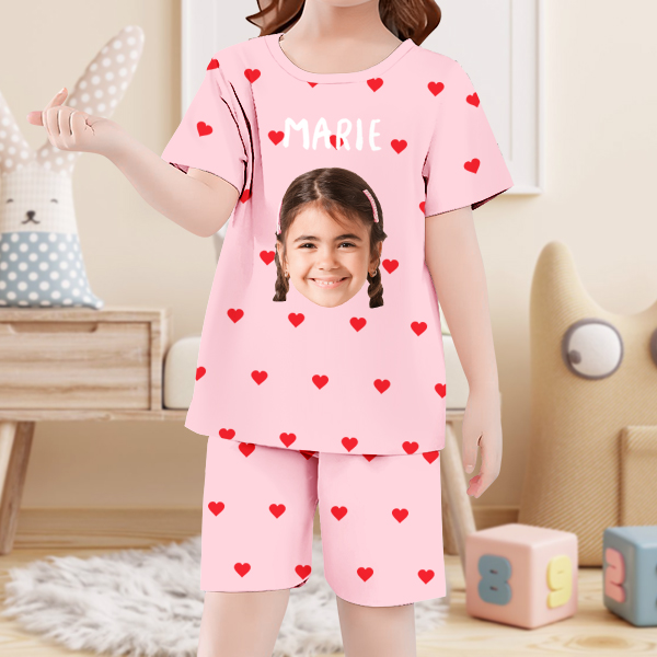 Custom Face And Name Pajamas Crew Neck Short Sleeve Short Pants Red Heart House-wear Suit For Kids