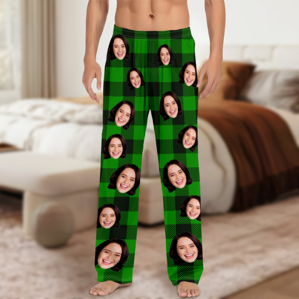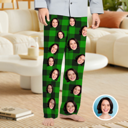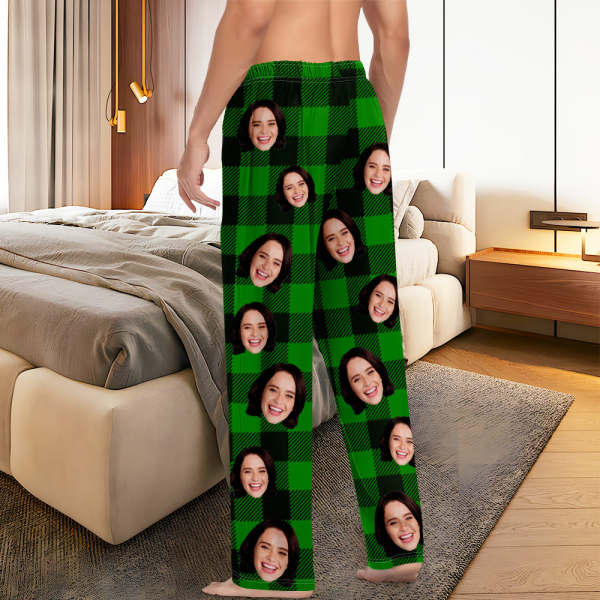 Custom Face Long Pajama Pants Custom Christmas Green Plaid Photo Pajamas Gift For Men