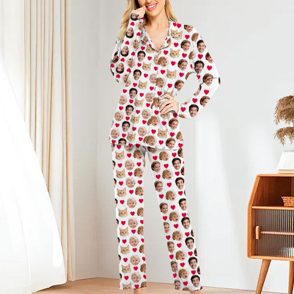 Custom Face Long Sleeve Button-front Long Pants Pajamas Custom Photo Pajamas Gift For Lover, For Couple