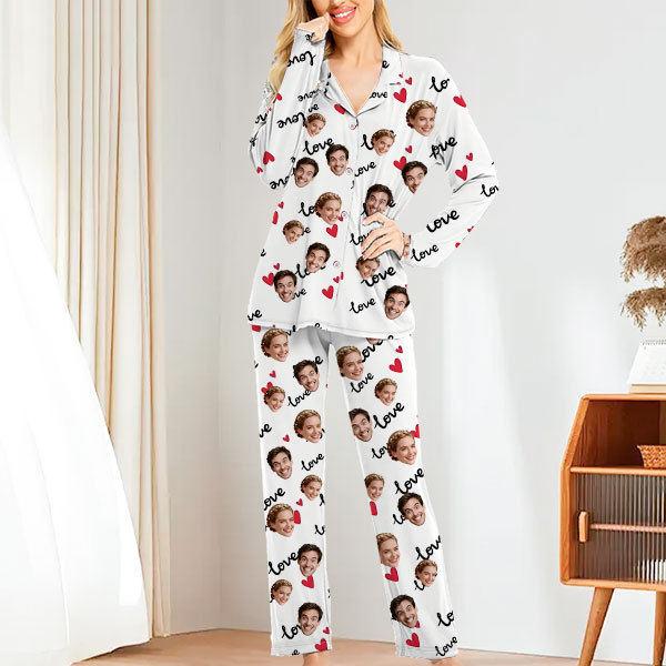 Custom Face Long Sleeve Button-front Long Pants Pajamas Custom Photo Pajamas Gift For Lover For Couples