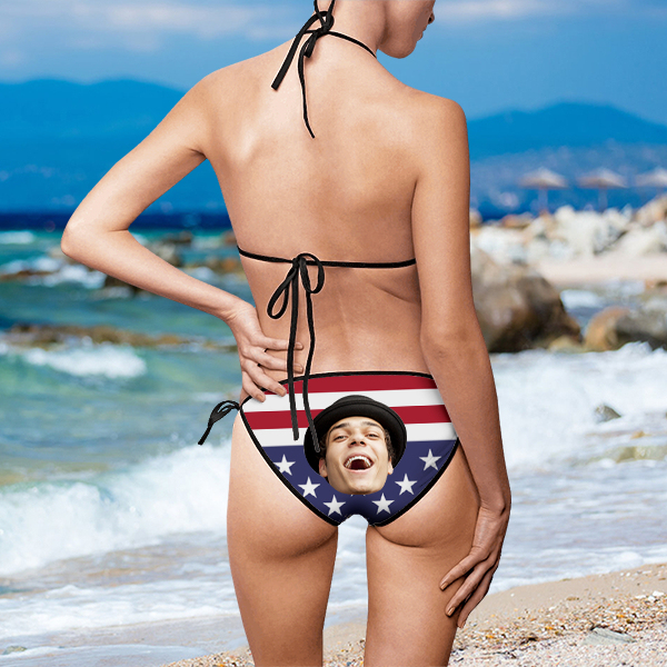 Custom Face Us Flag Elements String Halter Low Waisted Triangle Two Piece Bikini Set