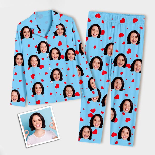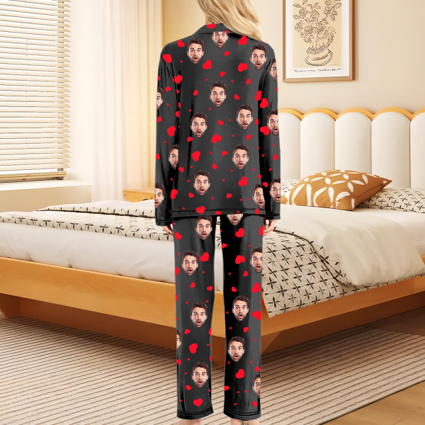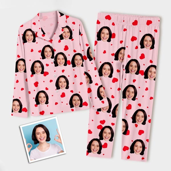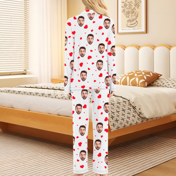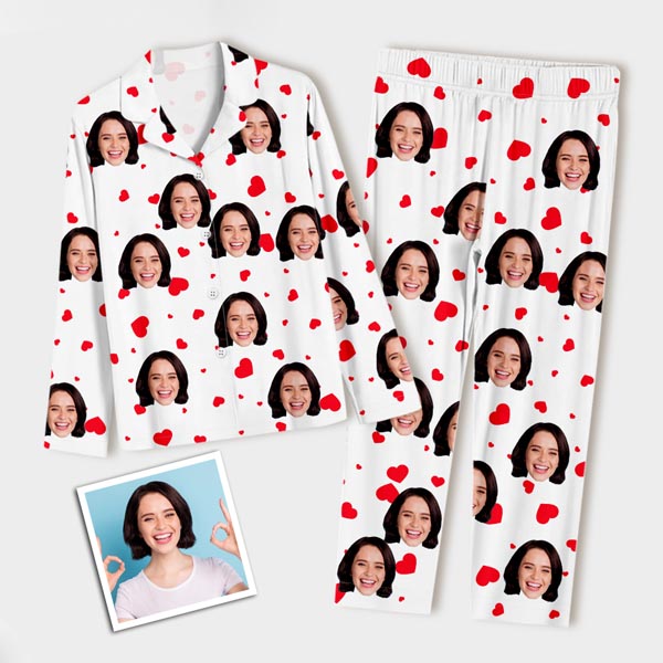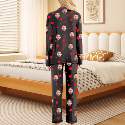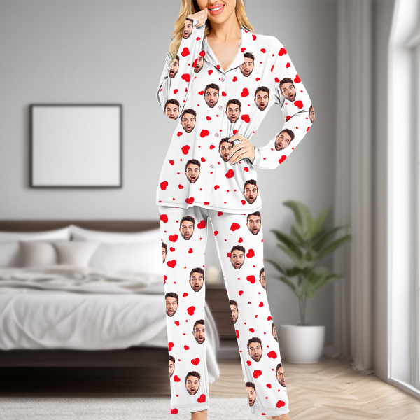 Custom Faces Long Sleeve Button-front Long Pants Pajamas Custom Photo Red Heart Pajamas Gift For Woman, For Wife
