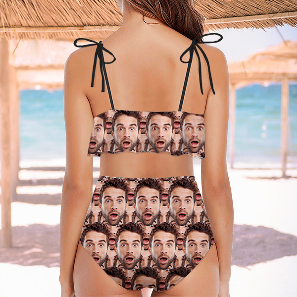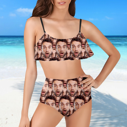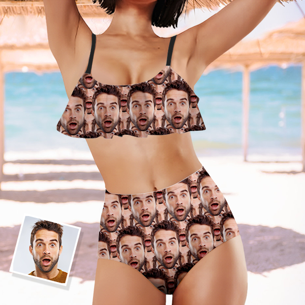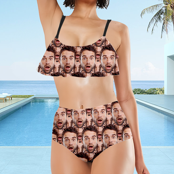 Custom Funny Face Bathing Bikini Suits Women's Ruffle Summer Suits High Waisted Two Pieces Multi Faces Bathing Suits Gift For Her