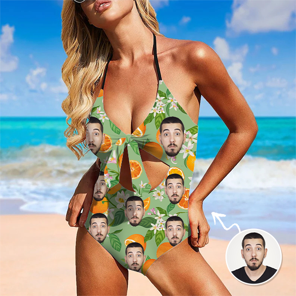 Custom Hawaiian Orange Swimsuit Halter Neck One Piece Summer Bathing Fruit Flower Swim Suits Outfits,gift For Her For Wife