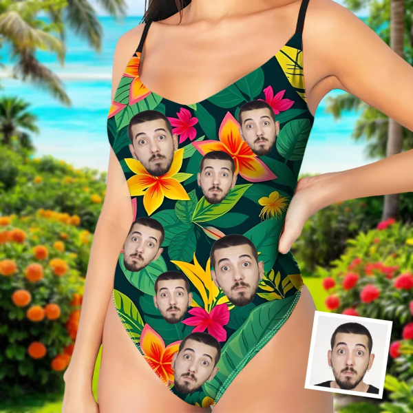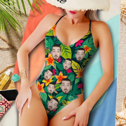 Custom Hawaiian V-neck One-piece Bathing Swimsuit Personalized Green Plant Straps Summer Swimsuit For Women,gift For Wife