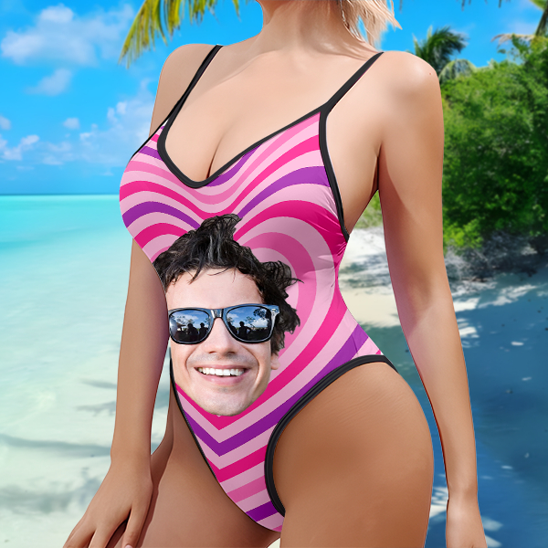 Custom Heart V-neck One-piece Bathing Swimsuit Personalized Photo Deep V-back Straps Sweet Love Swimsuit For Women,gift For Wife