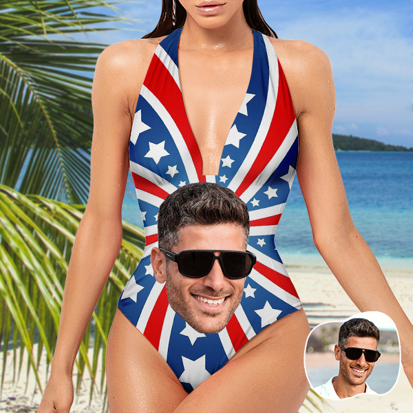 Custom Independence Day Halter One-piece Bathing Swimsuit Personalized American Flag Deep V-neck Swimsuit For Women, Gift For Wife
