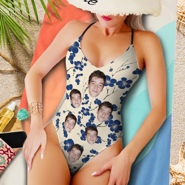 Custom Japanese Art V-neck One-piece Bathing Swimsuit Personalized Flower Straps Swimsuit For Women,gift For Wife