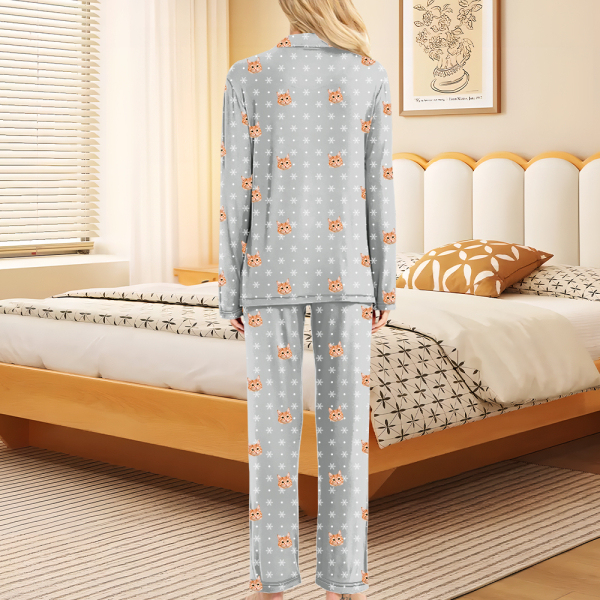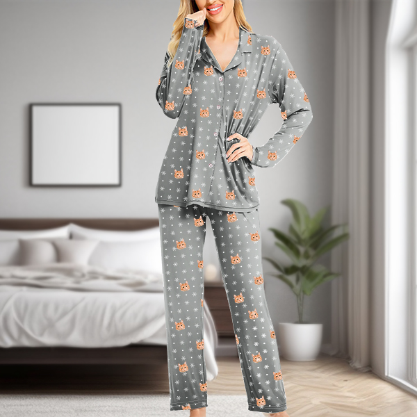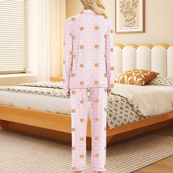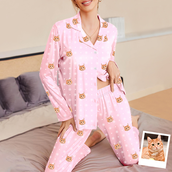 Custom Pet Faces Long Sleeve Button-front Long Pants Pajamas Custom Photo Pet Lover Pajamas Gift For Woman, For Wife