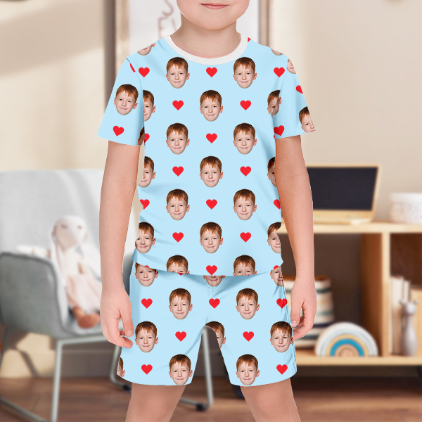 Custom Photo Heart Pajamas Crew Neck Short Sleeve Short Pants Face House-wear Suit For Family For Kids