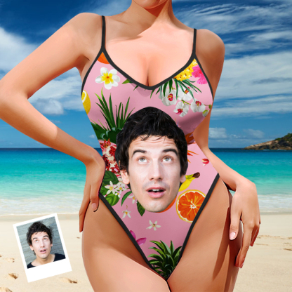 Custom Pink Fruit Flower V-neck One-piece Bathing Swimsuit Personalized Photo Deep V-back Straps Swimsuit For Women,gift For Wife