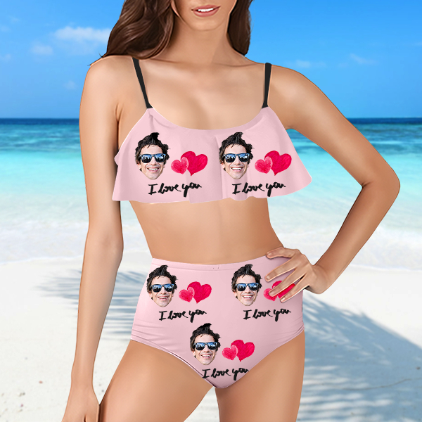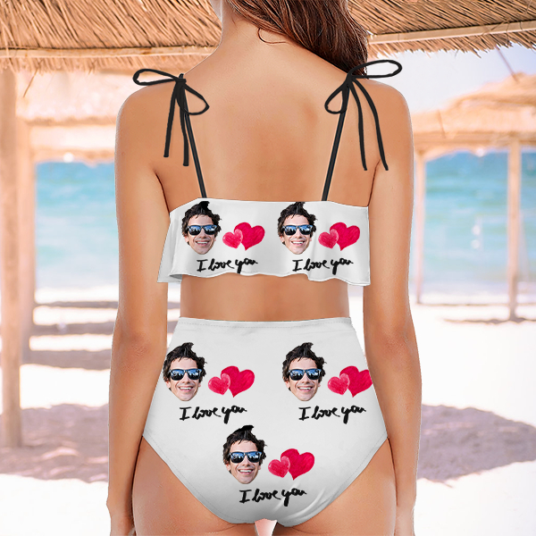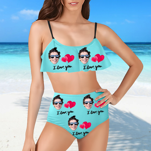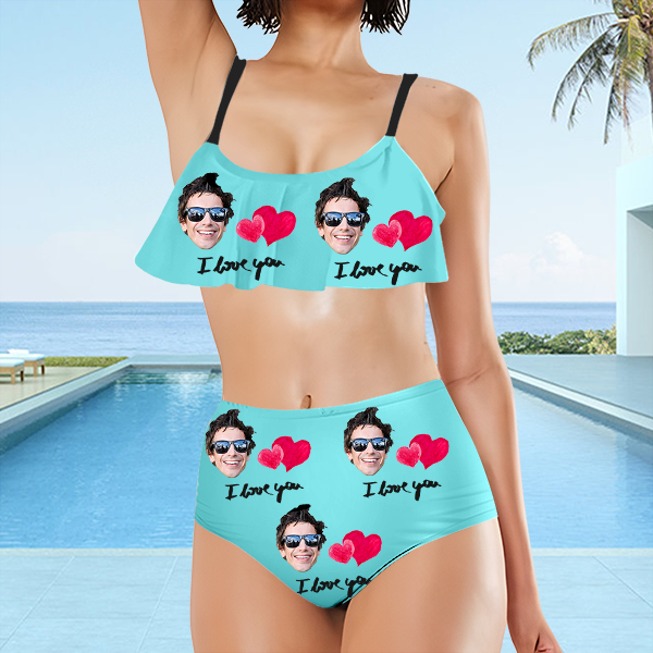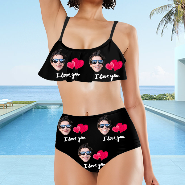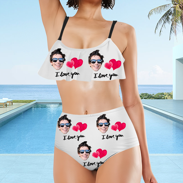 Custom Red Heart Bathing Bikini Suits Women's Ruffle Summer Suits High Waisted Two Pieces Hot Love Bathing Suits Gift For Her