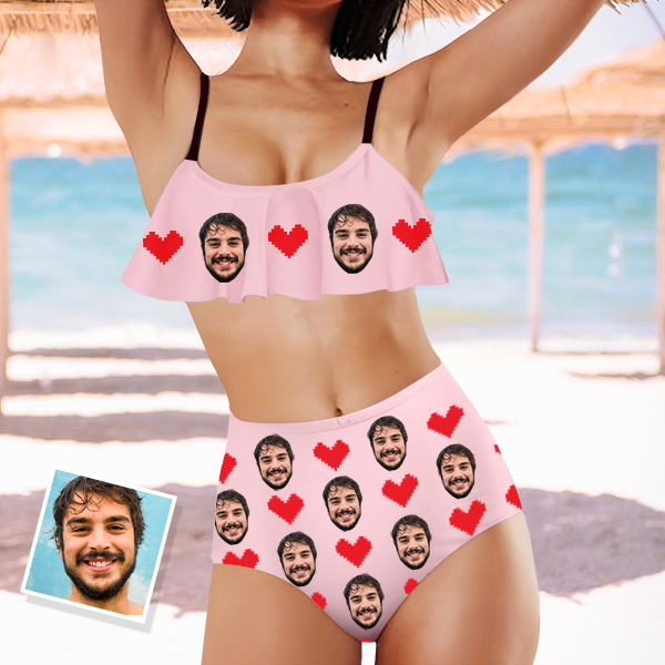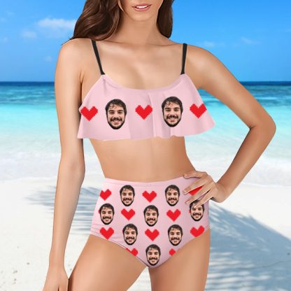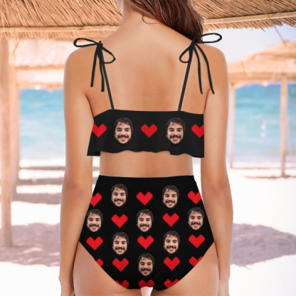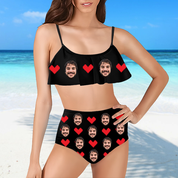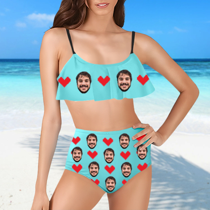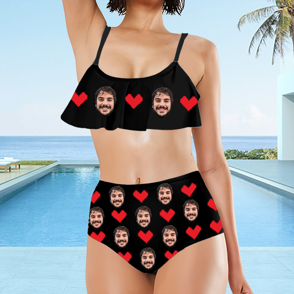 Custom Red Heart Bathing Bikini Suits Women's Ruffle Summer Suits High Waisted Two Pieces Love Bathing Suits Gift For Her