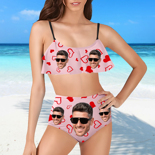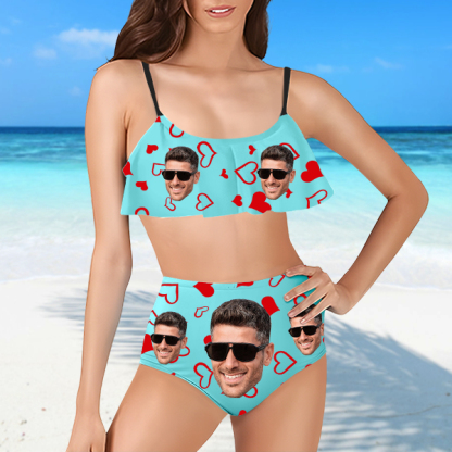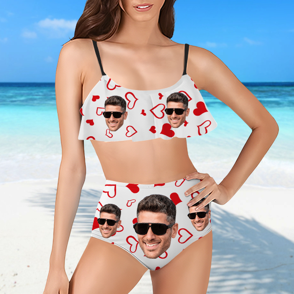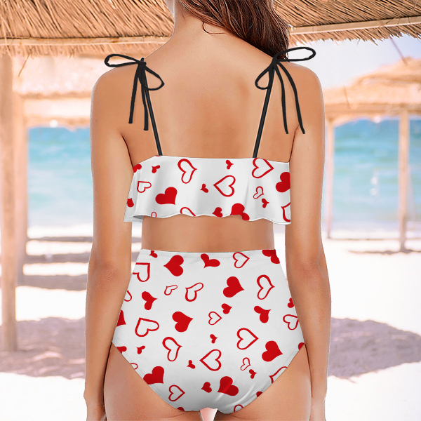 Custom Red Heart Bathing Bikini Suits Women's Ruffle Summer Suits High Waisted Two Pieces Lover Bathing Suits Gift For Her