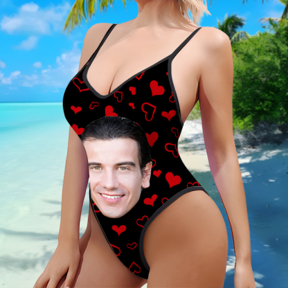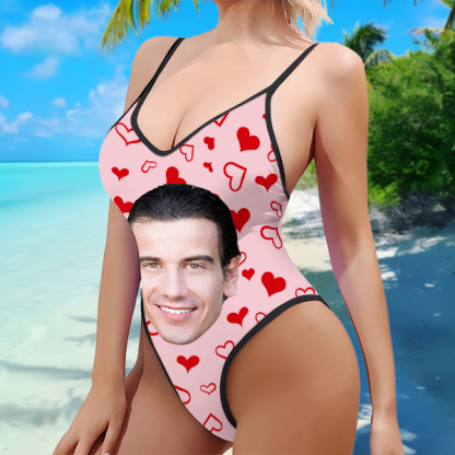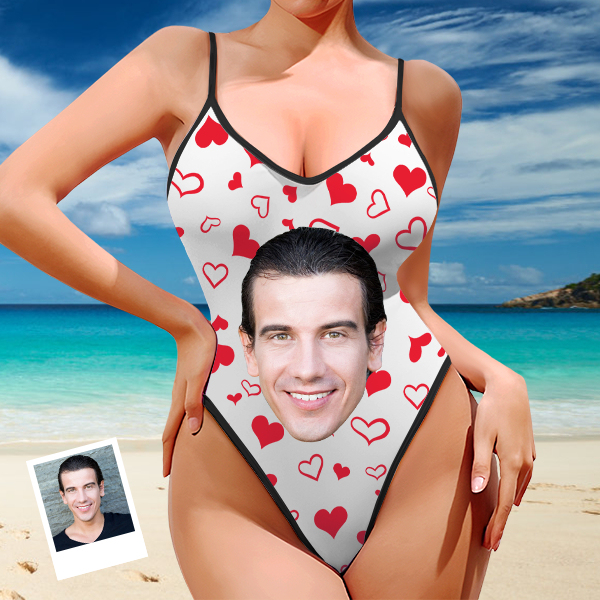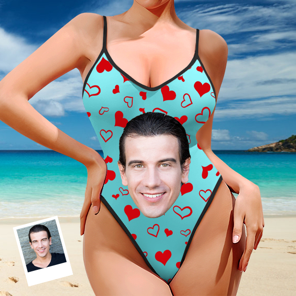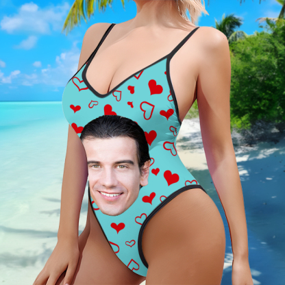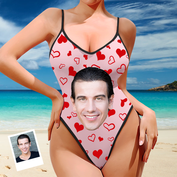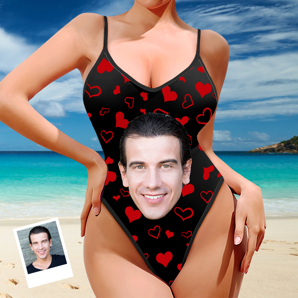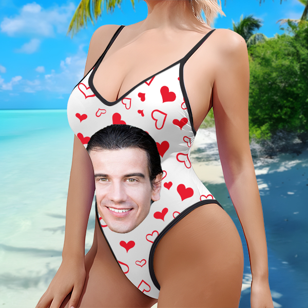 Custom Red Heart V-neck One-piece Bathing Swimsuit Personalized Photo Deep V-back Straps Swimsuit For Women,gift For Wife