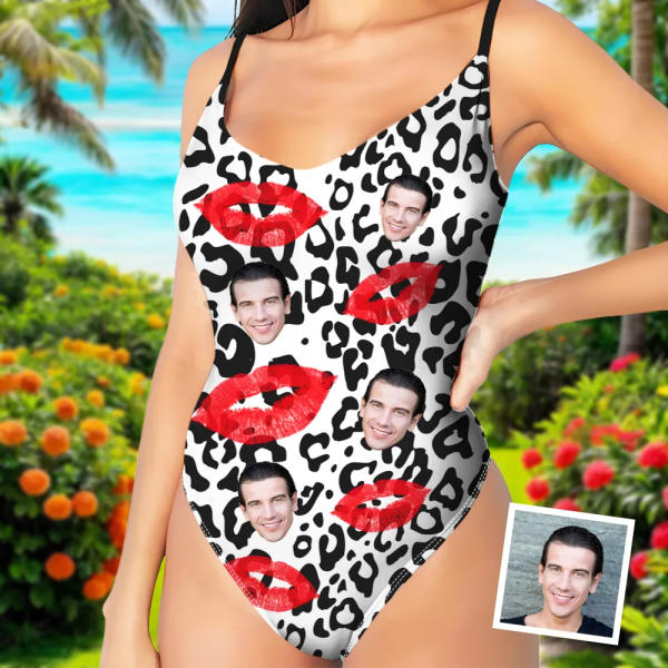 Custom Red Lips V-neck One-piece Bathing Swimsuit Personalized White Leopard Patterns Straps Black Swimsuit For Women,gift For Wife
