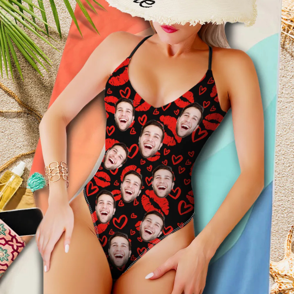 Custom Red Lips V-neck One-piece Straps Bathing Swimsuit Personalized Hot Love Heart Black Swimsuit For Women,gift For Wife